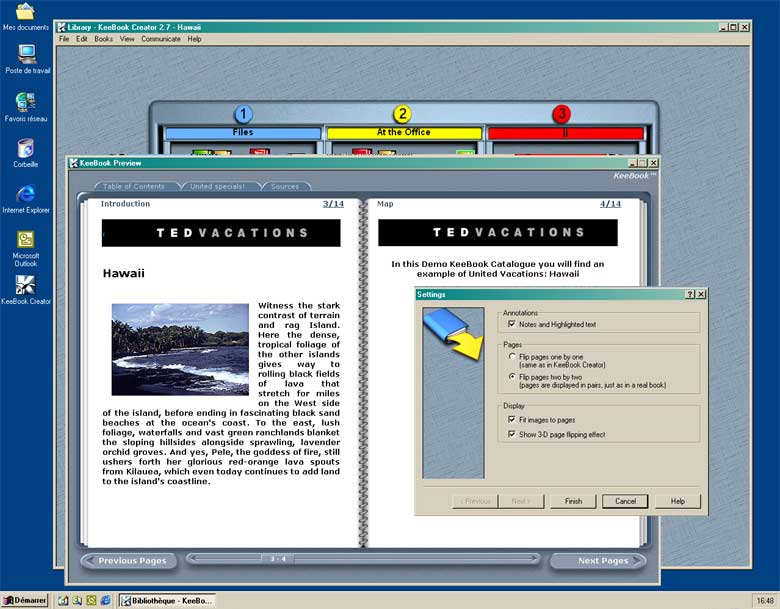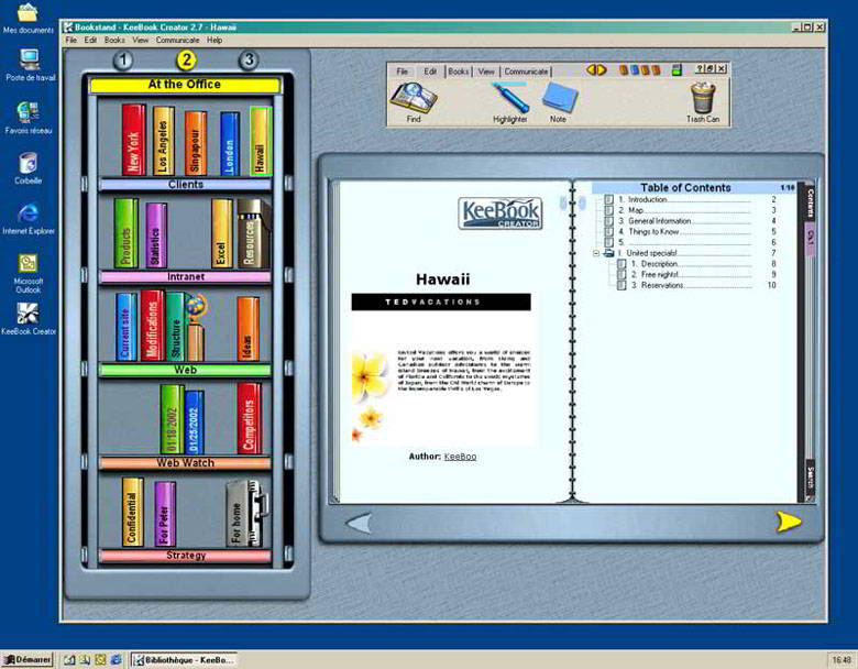 KeeBook Creator Pro По состоянию на 2008 год - это относительно дорогое (как пишут на сайте только!!! 249€), но, пожалуй, лучшее программное обеспечение для создания е-книг. И не только! В виртуальной библиотеке, KeeBook Creator дает возможность легко и просто создавать цифровые альбомы с текстами, фотографиями и мультимедийными документами. Создаваемые kee-книги можно аннотировать и классифицировать, располагая на виртуальных книжных полках программы, отправлять по электронной почте или просто помещать на вебсайте для распространения!KeeBook Creator позволит Вам включать аннотации к важным или интересным страницам, прикрепляя примечания относительно них или используя эффект подсвечивания. Ниже презентация различных режимов работы креатора.