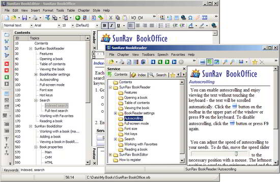 SunRav BookOffice - это набор инструментов, предназначенный для создания и редактирования книги. В его состав входят модуль создания книги SunRav BookEditor и инструмент для чтения SunRav BookReader. С помощью этой программы можно создать полноценную книгу, которая будет состоять из нескольких разделов, в нее может входить содержание и индекс. А инструмент для чтения предусматривает удобную навигацию между разделами содержания книги. При создании в книгу можно вставлять различные дополнительные элементы - таблицы, рисунки, гиперссылки, доступен импорт html, doc, txt-файлов. Единственным недостатком программы можно назвать то, что книги, созданные с помощью этой программы, сохраняются только во внутреннем формате программы и недоступны для редактирования. Но средства экспорта позволяют превратить этот файл в книгу в pdf-формате, файл справки chm, rtf, html-документы или exe-файл.