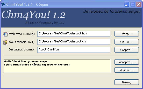 Chm4You! - компилятор *.htm (*.html) и декомпилятор *.chm файлов. Издатель выбирает исходный htm файл и в результате получает компактный документ в формате chm. Если обрабатываются offline версии сайтов, состоящие из множества страничек и картинок, то их также можно упаковать в один файл. При сборке нужно будет указать только основной файл - index.htm и т.п.Автором этой замечательной программы является Сергей Тарасенко. Скачивать ее можно совершенно свободно, как программу Freeware. Пользуясь случаем, хотим предоставить вам такую возможность. Берите => отсюда =>.