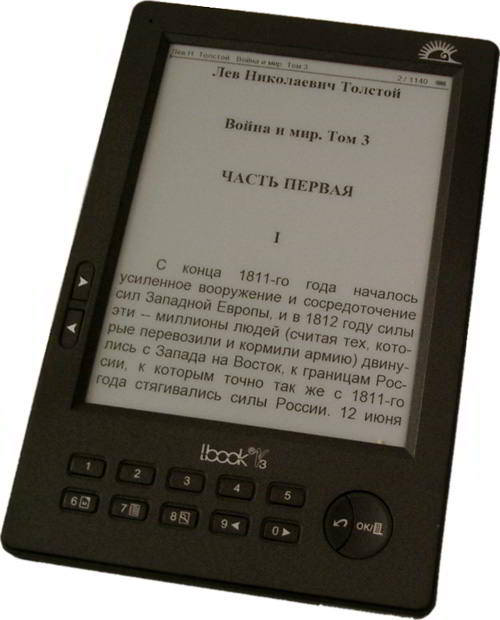 Жителям России и ближнего зарубежья предлагается купить свой собственный eBook ридер - lBook V3 (он же - HanLin eBook V3, который производится в Китае компанией Jinke). Можно считать, что данное устройство почти совсем не отличается от ридеров своего класса. Разве что у него немного хуже характеристики, чем у Sony Reader, к примеру, - 4 градации серого и USB 1.1 вместо 2.0. Но lBook имеет большое преимущество, которое важно жителям России - он уже русифицирован и различает множество форматов, среди которых - FB2, ставший почти стандартом для книг, которые скачиваются с русских сайтов. Этот ридер обладает своим собственным DRM-форматом - WOLF, а также различает многие распространенные форматы, среди которых PDF, TXT, HTML, DOC и DjVu. На нём можно также проигрывать музыку в MP3.