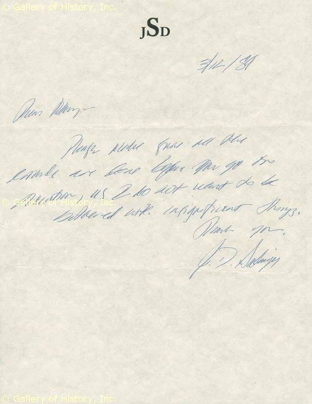 Записка Сэлинджера выставлена на eBay Записка автора одной из самых значительных и популярных книг современной американской литературы романа «Над пропастью во ржи», Джерома Давида Сэлинджера, которая адресована горничной, выставлена на аукцион eBay. Эту записку знаменитый писатель написал на канцелярской бумаге со своими инициалами. В связи с тем, что рукописные документы принадлежащие перу Сэлинджера настолько редки, что почти никогда не оказываются выставленными на аукционы, представителями компании Невады под названием History for Sale, которая продает эту записку, она оценена в сумму 50 тысяч долларов. |